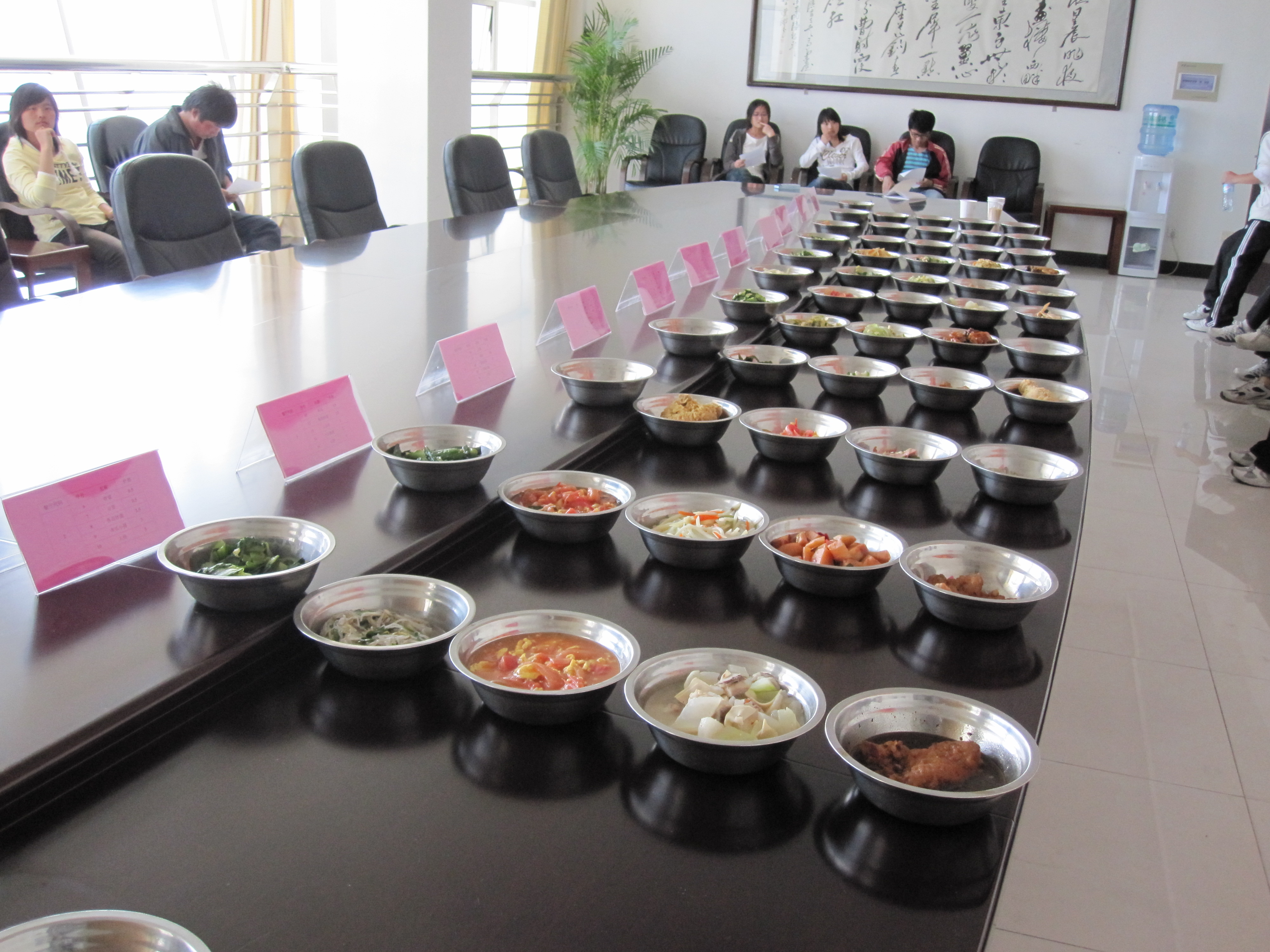 下午后勤管理处邀请周经理、丁经理、行政及系部部分领导、公司3家经营单位负责人及厨师长、院员工会生活部成员及各系部的生活委员共38人在1006会议室对6所高校60个菜品的性价比和口味进行现场评分。在评比活动中,每位师生都认真观察、品尝比较,为各食堂菜品的性价比和口味评分。活动结束后,由院员工会生活部员工对评比结果进行统计。测评结果见附表。