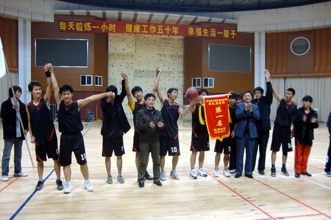 比赛伊始,我系队员们迅速投入比赛,个个雄姿英发,在“战场”上你争我夺,一轮轮地抢球,投球动作潇洒,帅气利索,争夺异常激烈,此时的篮球场已经成为他们最闪耀的舞台。比赛进行的如火如荼,双方队员都情绪高涨,观众亦激情四射。在精心的组织下,我系啦啦队声势浩大,在场边的加油欢呼声此消彼长,一浪高过一浪,尽情的为场上的队员呐喊助威,现场的气氛十分热烈。最终,我系代表队的一记漂亮的空中接力将比分拉至67比50,提前锁定胜局。比赛结束后,我系费建明副书记还亲自为冠军和亚军球队颁发锦旗和奖品,并与各队球员合影留恋。