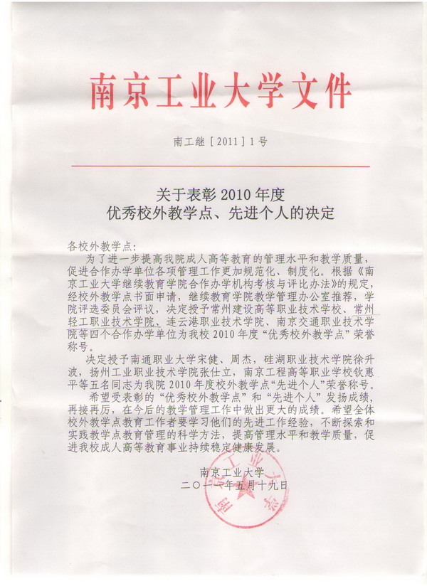 南京工业大学2011年继续教育工作年会5月19日在南京举行,来自省内外的五十余所合作办公司校共一百余人参加,公司有继续教育部俞亚珍主任、轻化系赵吕明副教授等出席,本次年会共评出4个“优秀校外教学点”和五位“先进个人”。因我系化学工程专业“专接本”在办学过程中成绩显著,被评为南京工业大学2010年度“优秀校外教学点”。