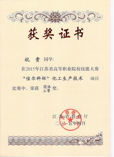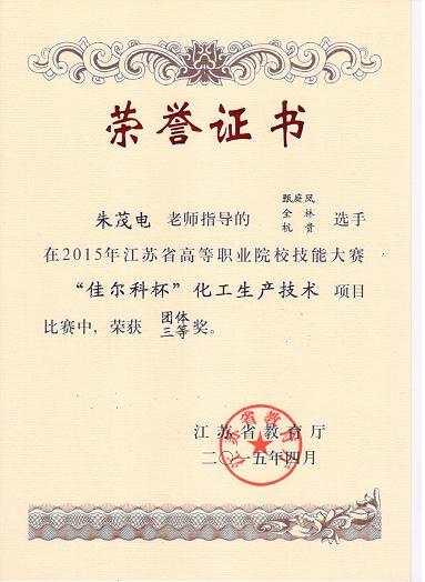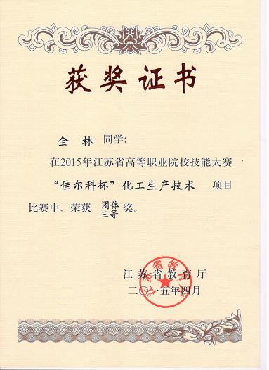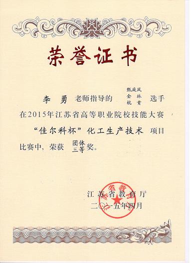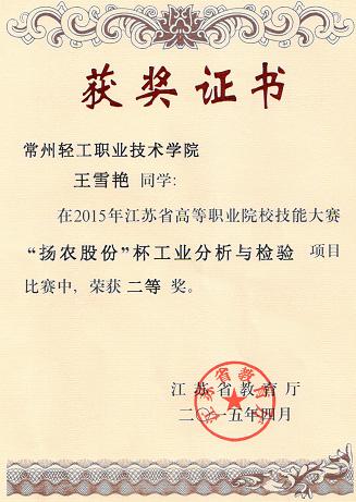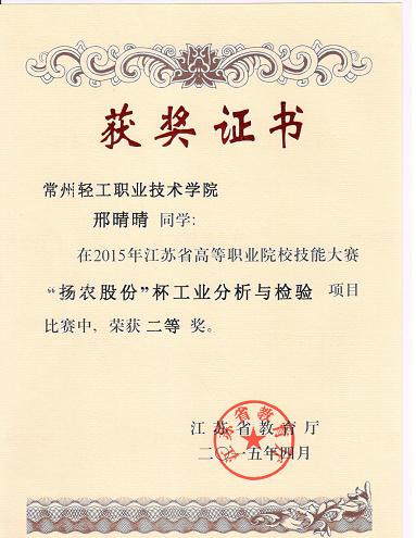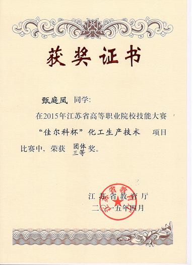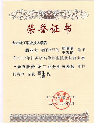 公司威廉希尔体育对本次比赛项目高度重视,派出了邢晴晴、王雪艳两位同学参加由扬州工业职业技术公司承办的“扬农股份杯”工业分析与检验项目大赛(26只参赛队),同时由甄庭凤、全林、杭贵三名同学组成的代表队,参加由常州工程职业技术公司承办的“佳尔科杯”化工生产技术职业技能大赛(14只参赛队),经过3天的紧张角逐,最终获得团体二等奖1项(二等奖排名第2)、三等奖1项(首次参赛,三等奖排名第1),个人二等奖2项、三等奖3项的好成绩。