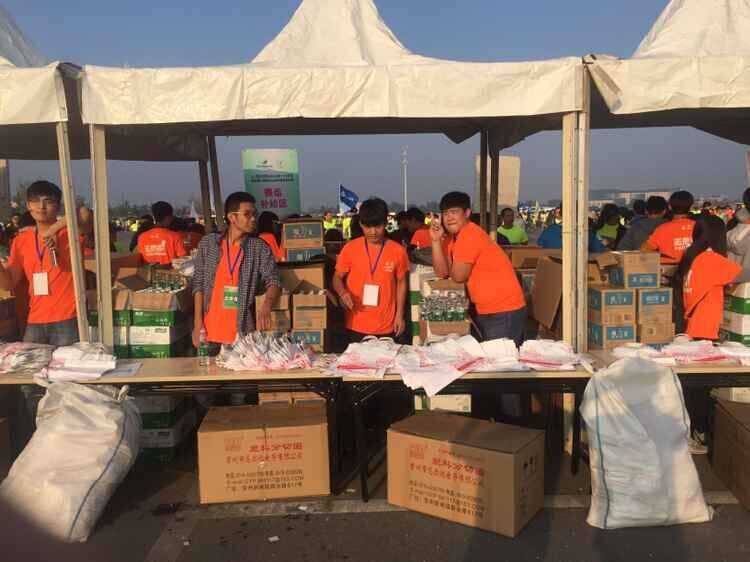 威廉希尔体育志愿者们负责赛后补给的分发。比赛开始时间为早8点,为保证提前到岗进行服务,志愿者们当天4点就已经起床进行准备,穿好指定服装,带好所需物品,在公司文体中心集合后吃早饭,于6点准时出发。到达场地后,天都还没有亮,志愿者们就进入了工作状态。马拉松比赛全程