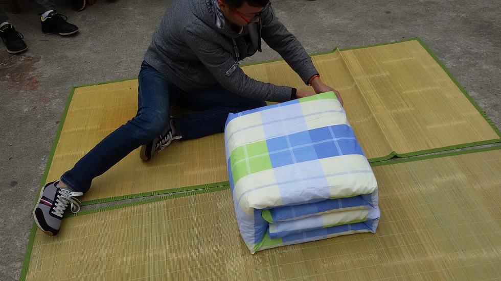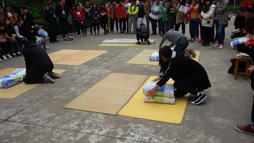 本次叠被子比赛以个人为单位,六人同时进行比赛,时间为5分钟,完成后由各位领导及评委打分点评。参赛选手热情高涨,我们的女同学也巾帼不让须眉,都拿出自己最好的水平来参加比赛。比赛开始,选手们纷纷迅速而又娴熟地开始叠被子,虽然没有军队中那种夸张地豆腐块样,但是也是有板有眼,压平、对折、捏角,一步接着一步有条不紊。大二的和大一的一起比赛,不过明显是大一的员工刚军训的影响还在,叠被子的速度和质量明显比大二的好,但是大二员工仍然积极比赛,争取取得好成绩。