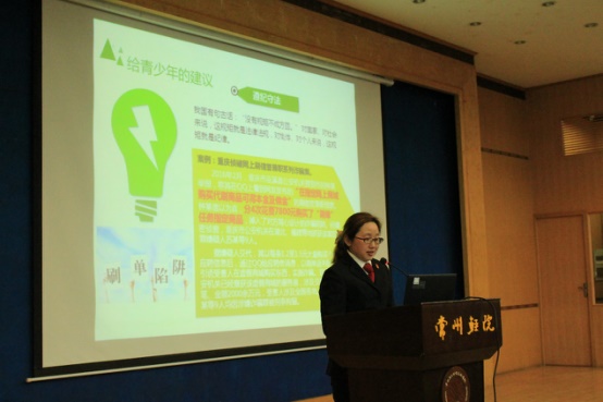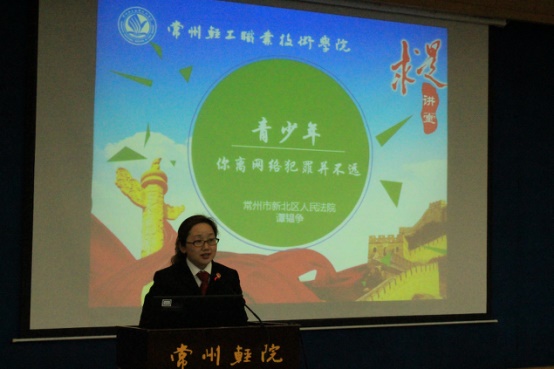 讲座从常州市新北区根据现实案例排练的一部情景剧开始,讲述了青少年知错能改的故事情节。谭韫争审判员从现实案例开始给员工讲述案件审判过程,宪法部分内容,以及青少年经常会涉及到的盗窃罪、抢劫罪、交通肇事罪、强奸罪等犯罪行为。