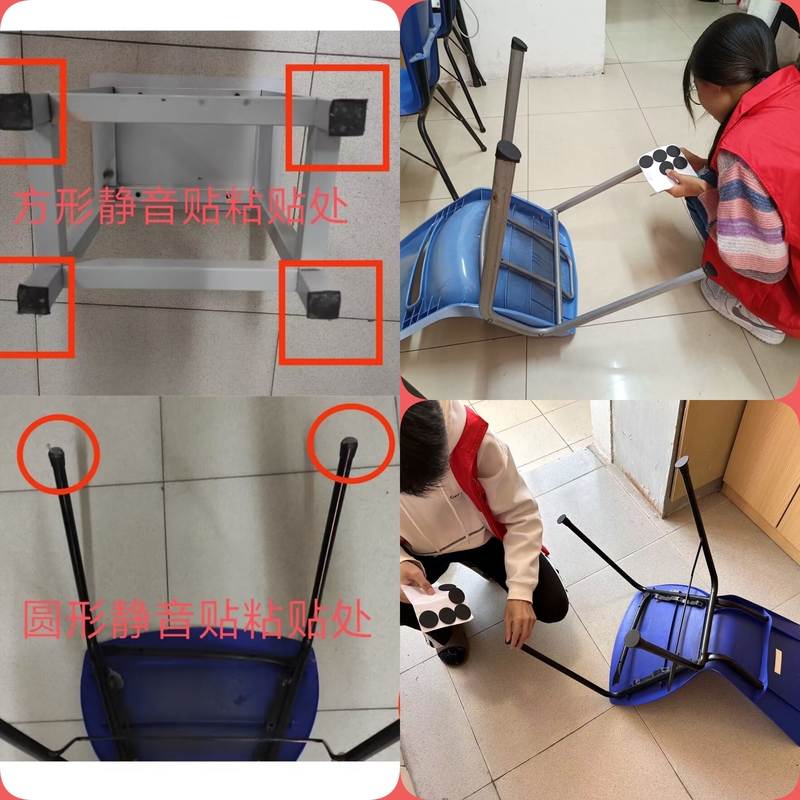 暖心静音贴,安静你我他。时间缓缓流过,磨平了椅脚套,伴随而来的是拖拉椅子刺耳的噪声。为了还你安静时光,威廉希尔体育为各位同学准备了静音贴。活动期间,志愿者们两两一组,佩戴好口罩,亲自上门服务,将宿舍的桌椅脚清理干净,贴上静音贴,并且给每个宿舍留下额外的静音贴备用。他们用爱守护,关心同员工活,为减少寝室桌椅挪动发出噪音而造成的困扰付出努力,引导同学们营造良好的寝室氛围。