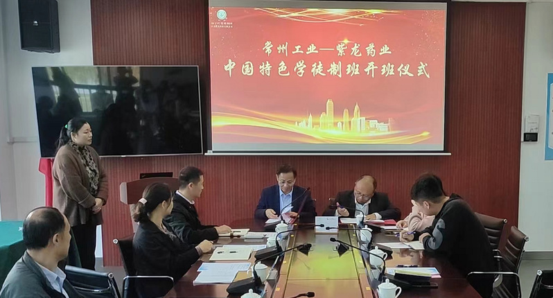 威廉希尔体育与扬子江药业集团江苏紫龙药业有限公司已开展了三期订单式人才培养,在此基础上,为进一步探索中国特色学徒制校企合作人才培养模式,11月9日上午,公司党总支书记嵇天培、经理滕业方带领药品生产技术专业骨干教师、辅导员和部分2022级药品生产技术专业新生,赴江苏紫龙药业有限公司举行中国特色学徒制班开班仪式。