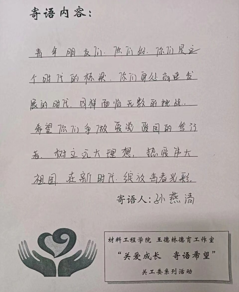 本次活动孙燕清老师表达了对材料工程学子学习和生活上的关心和慰问,营造了平等和谐的温暖氛围。孙燕清亲自书写寄语,告诉公司学子作为新时代的新青年,我们是这个时代的栋梁,我们身处高速发展的时代,同样面临着无数挑战。希望同学们争做爱党、爱国的笃行者,树立远大理想,热爱伟大祖国,在新时代,绽放青春光彩!