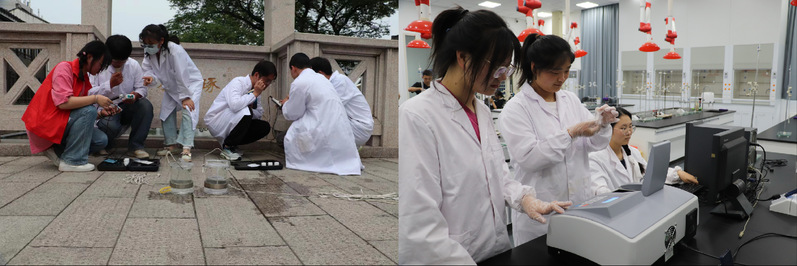 为了锤炼队员们的环境检测能力,现场采集了水样。在指导教师的训练下,队员们掌握了便携式pH、溶氧仪、灭菌器、紫外分光光度计等仪器操作,测得了南市河的水质。结果显示,南市河目前水质均值:pH为7.34,溶解氧为4.60 mg/L、总氮为0.86 mg/L、总磷为0.06 mg/L,目前南市河环境质量标准属于III类水左右。