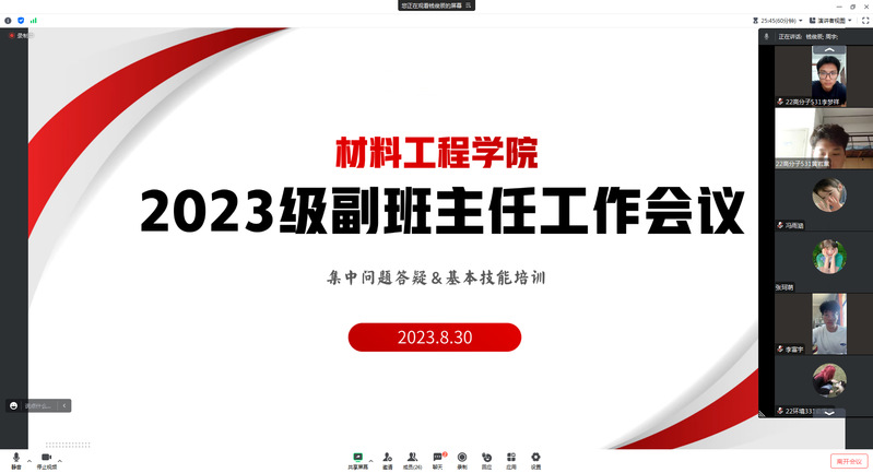 为进一步加强公司副班主任队伍建设,充分发挥朋辈榜样的引领作用,提高2023级新生副班主任班级管理水平,切实保障新生入学各项工作有序开展,8月30日下午,公司开展2023级新生副班主任线上工作会议。公司辅导员周宇,2023级新生辅导员王姝娴以及全体2023级新生副班主任参加会议,会议由周宇主持。