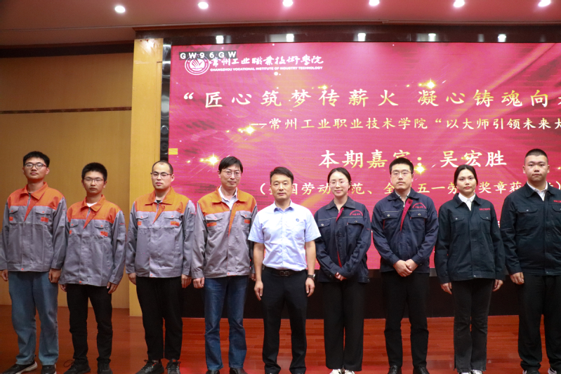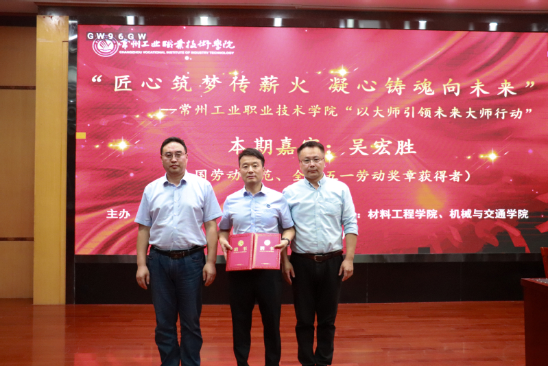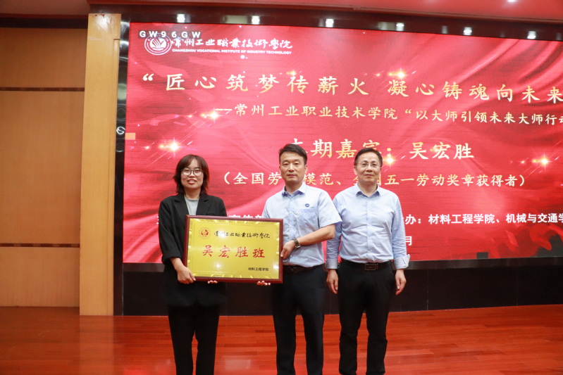 工匠公司经理袁飞、机械与交通公司经理徐伟共同为吴宏胜颁发了公司“以大师引领未来大师行动”师徒结对导师,青年教师传帮带导师聘书。吴宏胜和威廉希尔体育经理滕业方一起为23高分子531班授予“吴宏胜班”班牌,希望该班的同学们能够在实践中练就过硬本领、培育精益求精的工匠精神。