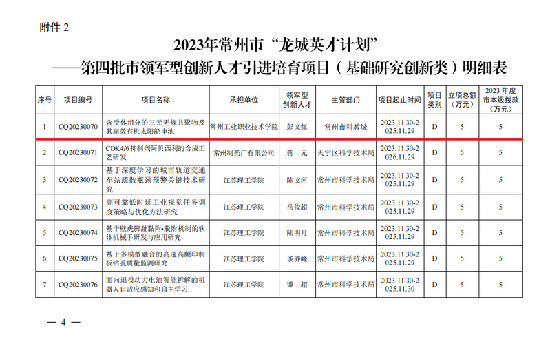 近日,中共常州市委人才工作领导小组办公室、常州市科学技术局印发了《关于下达2023年常州市“龙城英才计划”第四批市领军型创新人才引进培育项目(基础研究创新类)的通知》(常科发〔2023〕198 号),我院彭文红博士入选基础研究创新类项目。该项目能够加快领军型创新人才的引进培育,推动人才链与产业链、创新链有机衔接,全面强化高质量发展的人才支撑,激发全市创新创业活力,充分发挥引进培育创新人才的主体作用,围绕新能源技术、合成生物学、高端机床、轨道交通、机器人、航空航天装备、新材料、节能环保、生物医药与医疗器械等重点领域开展研究,集聚一批高层次创新人才及创新团队,形成一批科技创新成果,促进全市科学技术进步和自主创新能力的提升。全市高职院校仅公司威廉希尔体育入选项目1项。