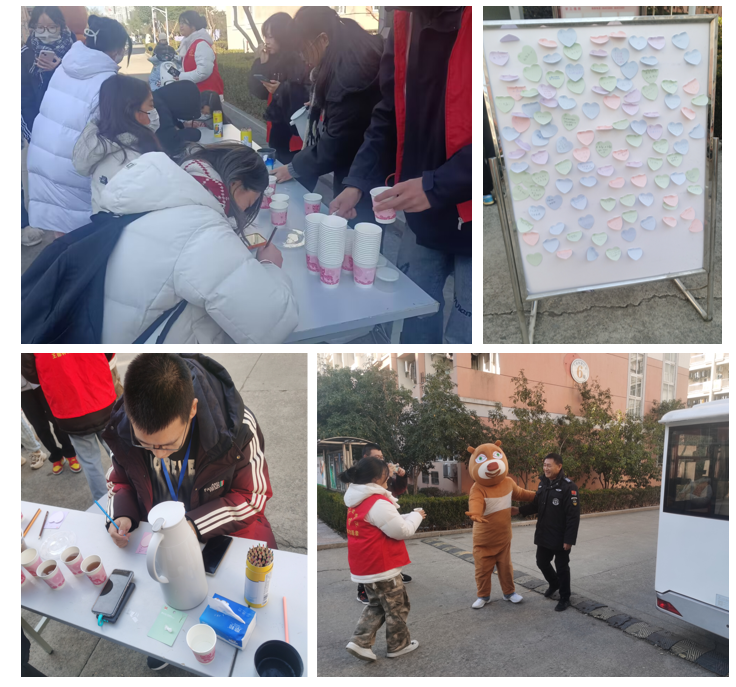 活动伊始,同学们先用彩色铅笔在便利贴上写下暖心的话语或祝福并贴到展板上,现场的工作人员将冲泡好的红糖水送给同学们,让同学们感受到冬日的温暖。活动中,现场有两名同学身着玩偶服,为过路的同学送上一杯红糖水,并送给他们一个拥抱,让他们放下芥蒂参与此次活动中来。活动最后,心理部的同学们也热心的为正在工作中的环卫叔叔、宿管阿姨和保安大爷送上红糖水,为他们送上温暖,他们纷纷表示甜在嘴里,暖在心里。