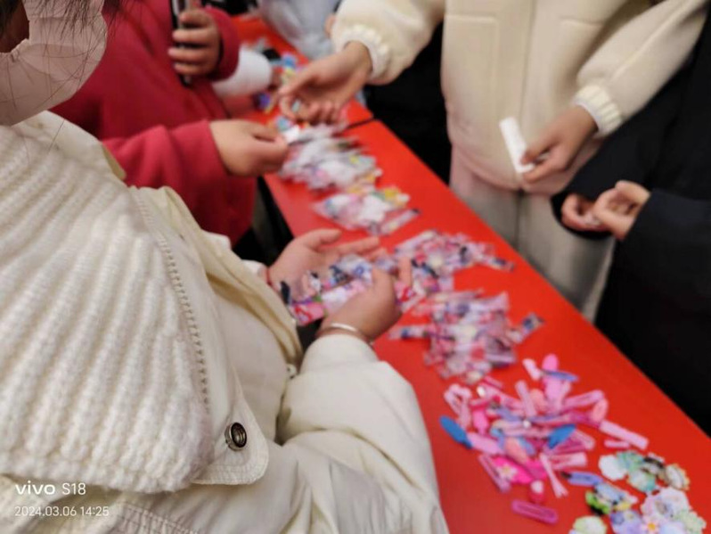 活动现场,在现场工作人员的引导下,同学们先与立牌合影,合影之后即可参与抽奖。现场准备了品类丰富的奖品,有扭扭花、胸针、石膏娃娃、发卡等同学们喜爱的奖品,每位同学都可以获得自己想要的奖品。抽奖活动中,同学们紧紧地围在抽奖箱周围,许愿自己能够抽到自己想要的奖品。抽到的同学兴高采烈地举起手中的奖品,向其他同学展示着自己的幸运。整个活动过程中,欢声笑语此起彼伏。