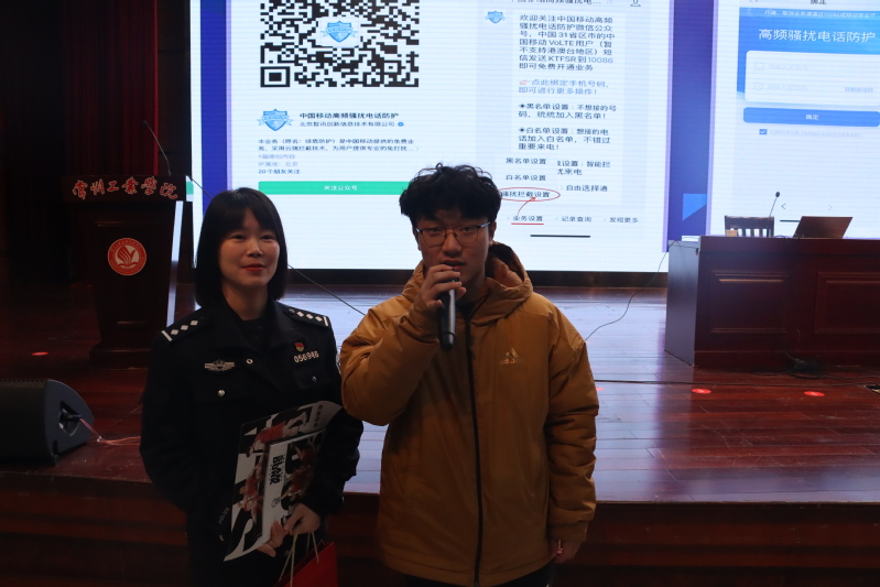 讲座中,陈警官通报了近期科教城高校的诈骗警情,并从冒充电商物流客服类诈骗、虚假购物类诈骗、买卖游戏账号诈骗、冒充熟人类诈骗、兼职刷单类诈骗等五类常见的诈骗类型,针对性的把老员工经常遇到的诈骗实例进行了剖析,并传授识别、防范诈骗的方法和技巧,提高了同学们反诈安全意识。活动现场,陈警官通过有奖互动问答的方式,活跃了气氛,增强了广大师生识骗、防骗、拒骗意识,有效筑牢了校园安全防线。