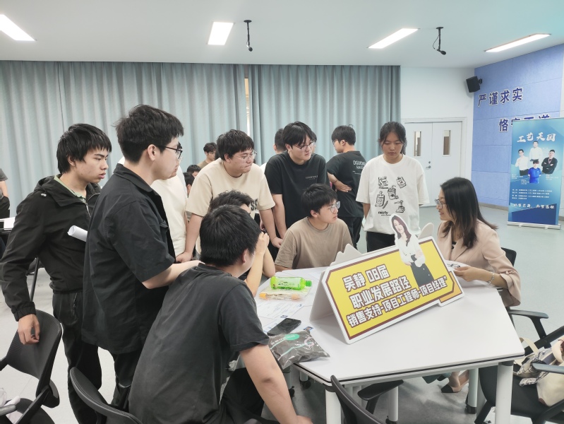 在分享会上,吴静回顾了自己的大学时光,她特别强调了专业知识的重要性,并指出这些知识在日后工作中会发挥关键作用。同时,她还贴心地提醒同学们,在撰写简历时要善于发挥自身的长处,规避短板,以更好地凸显个人优势。随后,吴静详细分享了自己在企业中的成长轨迹,从最初的质检员起步,逐步成长为售后服务专员、项目工程师,直至现在的项目经理。她以自身的经历告诉大家,职业发展需要不断学习和努力。在此基础上,她给出了三条宝贵的建议:一是要学会选择,明确自己未来的发展方向;二是要学会坚持,面对困难和孤独时要保持毅力,不轻言放弃;三是要学会规划,合理安排时间,结合自身情况制定学习计划。另一位分享嘉宾杨文平也分享了自己的工作与生活状态,并对母校的培养表达了衷心的感谢。他自豪地谈到了母校的发展壮大,并为在座的同学提出了几点实用建议。首先,要有精英意识,让老员工活充实而有意义;其次,要敢为人先,勇于尝试新事物,增加个人阅历;再次,要有冒险精神,面对困难时要勇往直前、敢于挑战;最后,无论做什么事情都要有责任感,始终秉持负责任的态度。杨文平希望同学们能够珍惜在校时光,努力学习提升自己,为未来职业生涯奠定坚实基础。