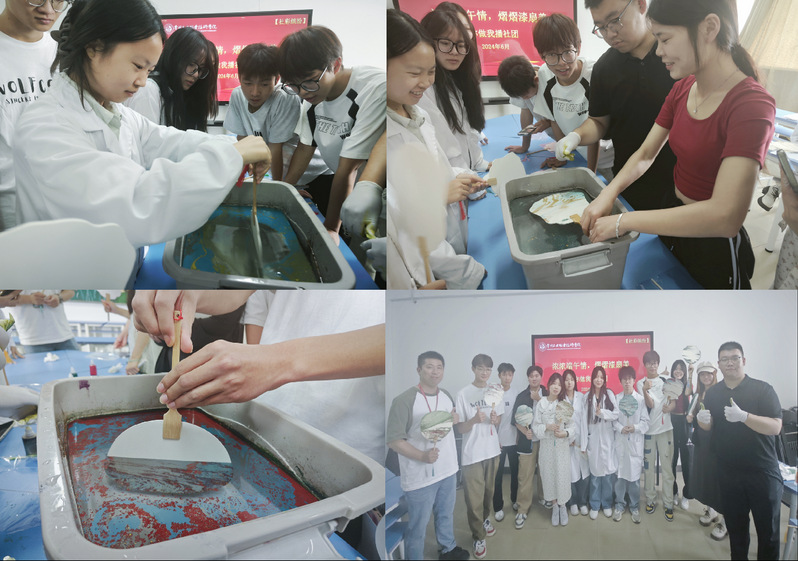 漆扇是以扇子为载体,运用漆器工艺制作而成的艺术品,展现了中国传统文化的瑰丽和精致。活动伊始,社团指导老师郑新涛首先向同学们介绍了漆扇的历史、制作工艺和文化内涵,让同学们对漆扇有了更深入的了解。随后,同学们充分发挥创意,选用各种色彩搭配,然后采用“漂漆”技法,利用漆不溶于水的特质以点、甩、弹、划等手法在水面绘出图案效果,制作出一幅幅精美、独一无二的的漆扇作品很快就呈现在了大家面前。它们或清新淡雅,或艳丽夺目,每一把漆扇都蕴含着同学们的创意。来自回族的靳亦凡同学感慨道:“作为少数民族的一员,很荣幸参加本次活动,切切实实体验了非贵文化,希望以后公司也能多举办类似的活动。”来自苗族的吴长福表示“大家制作的漆扇色彩艳丽各异,正如56个民族一样,独特而鲜明,犹如五色糯米饭一样牢牢粘在一起,像石榴籽一样紧紧抱在一起。”