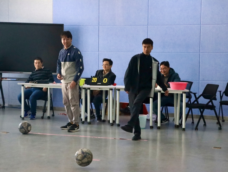 两次往返的时间计成绩;排球颠球由每团队出一人,按照规定方式将排球颠至一定高度,如果球落地仍可以继续,最后按颠球个数计成绩;最后一个项目足球趣味射门,每团队出3名选手,每名选手有5次机会。具体方式是将球射向规定距离的小球门中,最后按三名选手进门的总次数计成绩。吴董事长在该项目中作为选手上场秀了一下脚法,五次射门竟然进了三个,全场最高,赢得满场彩!