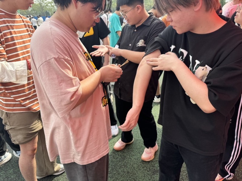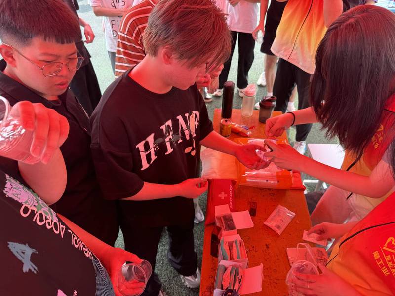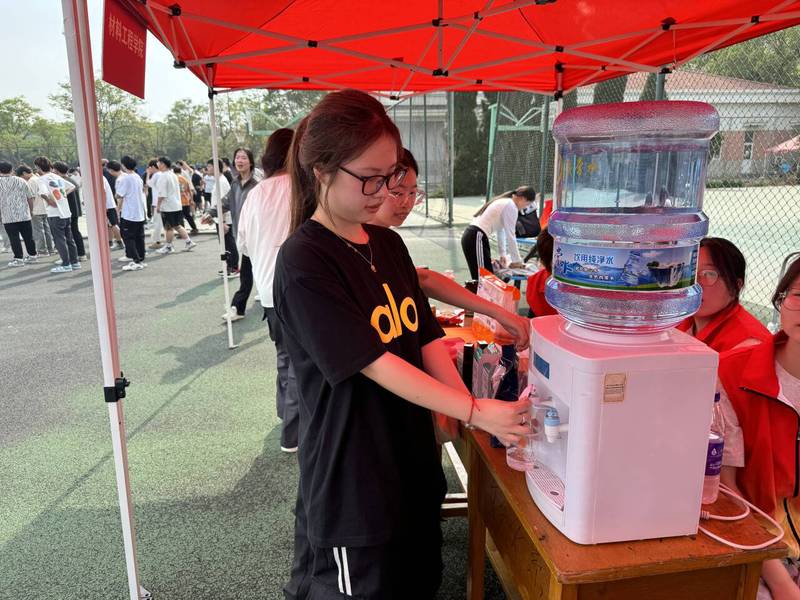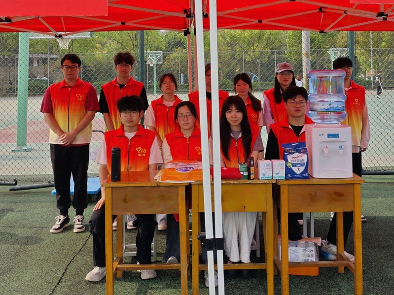 威廉希尔体育员工党支部党员先锋岗成员提前到达指定地点,搭建好帐篷,准备好饮用水、碘伏、创可贴等必备药品以及急救包,勤勤恳恳,不辞劳苦,为体测同学提供帮助和服务。在体测开始前,志愿者们帮助同学们保管衣物及手机等贵重物品。同时,志愿者时刻关注着同学们的身体动向,为有需要的同学们提供免费的水和药品,为在体测中受伤的同学提供基本的止血、包扎等急救措施。