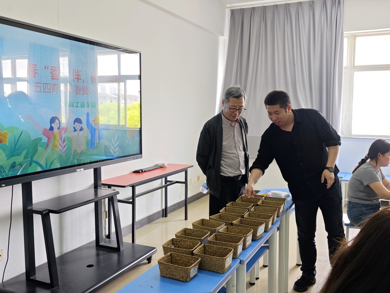 本次活动邀请了赵吕明进行指导,“香囊是中国民间艺术的瑰宝,其文化历史性作为民族精神内涵不可分割的一部分,蕴含着源远流长的文化内涵。香囊从先秦时期初现雏形,到唐宋成为日常配饰,到现代.....”赵老师现对香囊的文化内涵、起源与发展历程进行详细讲述,历史故事让青年们沉浸其中。随后,在赵老师的悉心指导下,师生们纷纷挑选喜爱的香囊包,认真闻香配香,填充香料,收口整形,每一个步骤都饱含着大家对传统文化的热爱与敬意。