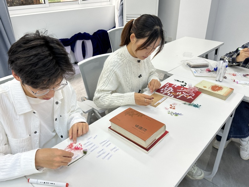 活动中,嵇天培首先以《乡土中国》《平凡的世界》等经典书名为例,示范如何通过关键词提取、意象重组激发创作灵感。接着,员工们手持书名字条,在“红色经典”“科幻探索”“人文思考”等主题卡片上自由拼贴,同时点缀上各种树叶、花朵等装饰物,作品形式丰富多彩。最后,金华仁现场点评指导,强调“拼贴不仅是形式创新,更是对经典内核的思考”。其中一位参与活动的同学表示:“通过拼贴诗活动,重新发现了书名背后的深意,也体会到碎片化阅读时代深度思考的重要性。”