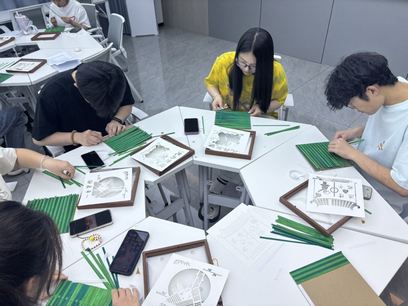 活动现场设置了“非遗探源”“匠心竹韵”“创意展评”三大板块。在“非遗探源”环节,由社区员工干部系统讲解了端午习俗与竹编文化的历史脉络,同学们深入了解了这项国家级非遗技艺的千年传承。随后的“匠心竹韵”创作环节,同学们在老师的指导下开始设计图样、裁剪、编织等工作。现场既有专注编织的静默时刻,也有讨论技法的热烈交流,最终诞生了《龙舟竞渡》《艾草飘香》《浓情端午》等20余幅主题鲜明的竹编作品。活动特设“创意展评”环节,由社区辅导员周宇老师从技艺性、创新性等维度评选优秀作品,并通过公司“一站式”社区党团活动室进行专题展览。