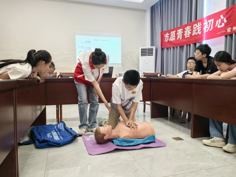 在模拟假人前,孩子们在红十字救护员引导下分组练习胸外按压和人工呼吸,救护员逐一纠正动作细节。本次课程还针对暑期高发的溺水、触电、火灾等意外,设计互动问答环节,帮助孩子们掌握风险识别与自救互救能力。