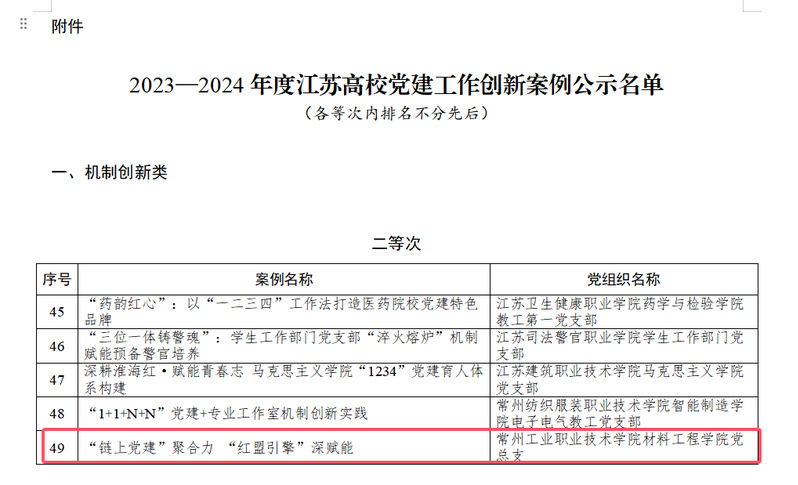 近日,江苏省委教育工委公布了2023—2024年度江苏高公司党建工作创新案例名单,公司党总支《“链上党建”聚合力“红盟引擎”深赋能》获得机制创新类案例二等次。