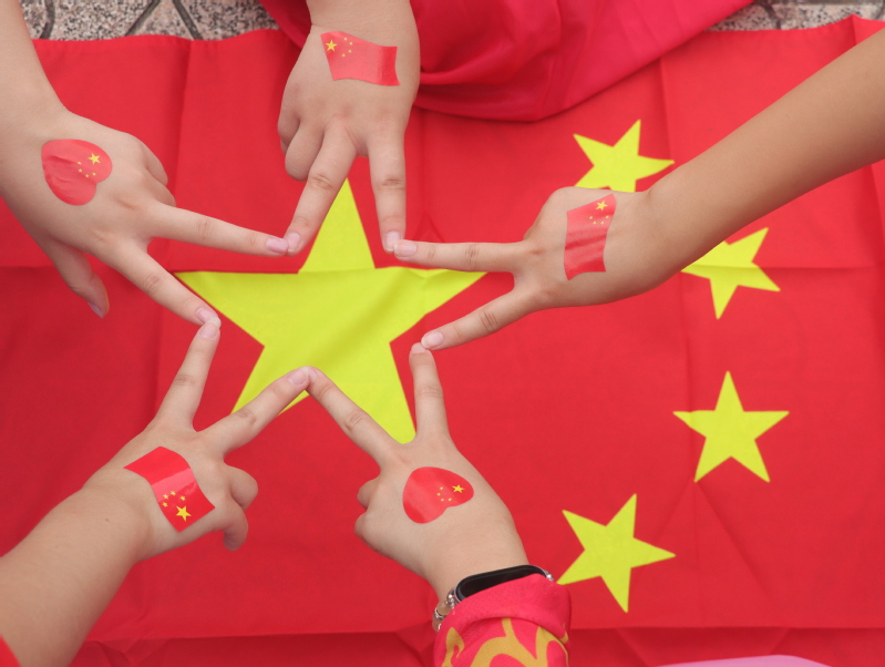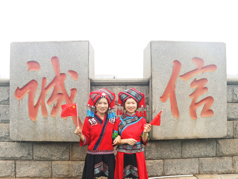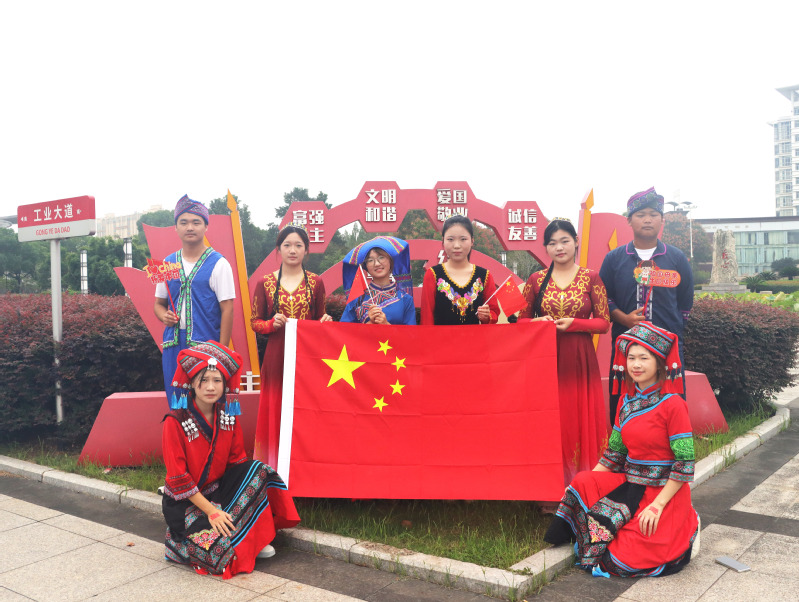 “我与国旗合张影”创意摄影活动中,同学们身着各具特色的民族盛装,与鲜艳的五星红旗创意同框。壮族员工身着绚丽的民族服装,手举祝福祖国的标语牌和小国旗;土家族员工身着传统织锦服饰,在国旗下欢快展示摆手舞的独特韵味。同学们还自发组成同心圆队形,寓意各民族像石榴籽一样紧紧抱在一起。这些充满创意的合影,既展现了各民族文化的丰富多彩,又表达了各族青年对祖国的深厚情感。