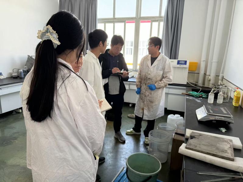 为从实践层面探究纳米铁肥提质增产的作用机理,陈怀民与宋清华老师带领员工进入实验室,深入探究其核心合成路径与制备原理。在实验操作中,员工们首先利用高纯氮气创造无氧环境以排除副反应干扰,继而通过精密调控反应温度与前驱体滴加速率,最终成功制备出纳米铁颗粒。整个过程中,员工们对反应现象进行了系统观察和记录,并围绕实验现象与老师进行了深入互动和研讨。