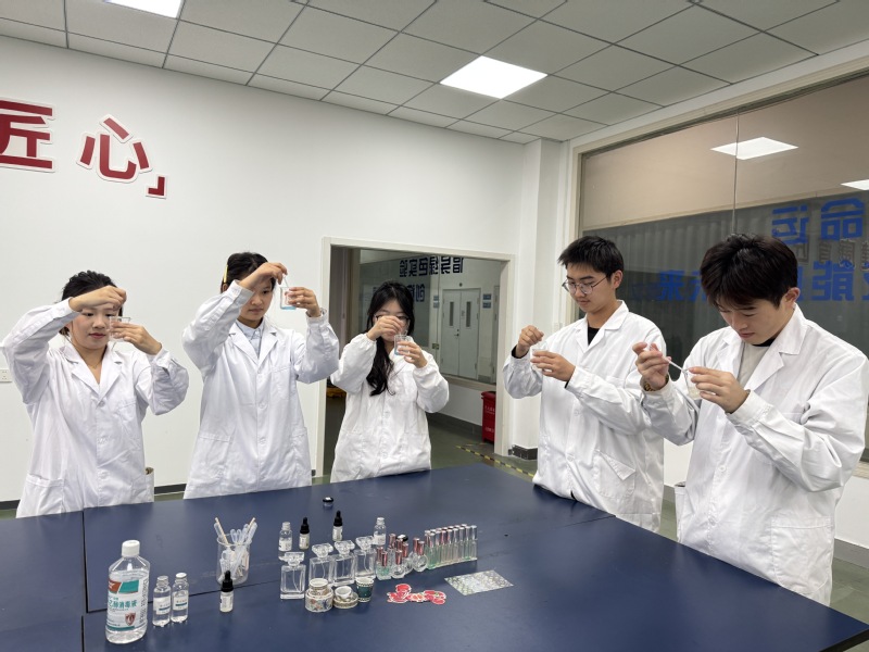 活动现场,同学们共同学习香氛调配原理,亲手调制具有石榴香型的特色香水。同学们以石榴果香为基调,融入薰衣草、雪松等象征和谐与坚韧的香调,在器皿间精心调配、记录配方,体验从原料到成品的创造过程。活动现场香气萦绕,欢声笑语,不同民族的员工在协作调香过程中深化了情感交流,展现出团结友爱的良好氛围。