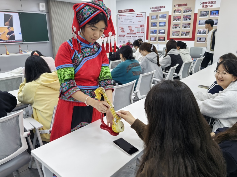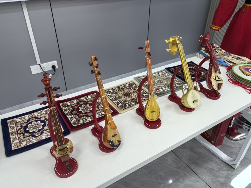 本次主题展内容丰富,主要分为少数民族服装展与民族器乐展两大部分。服装展不仅通过模特假人静态展示了维吾尔族、壮族以及布依族的传统服饰,还特别邀请了少数民族同学身着本民族盛装进行现场讲解,让观众在互动中深入了解服饰的特色与文化内涵。展出的民族纹样手提包、桌垫等文创物件,巧妙地将传统美学融入现代生活,深受同学们喜爱。在民族器乐展区,维吾尔族的弹布尔、热瓦普、艾捷克等乐器实物首次与观众见面,让大家得以近距离观察其独特构造;同时,主讲人员还系统介绍了多个少数民族的代表性乐器,全面展现了中华音乐文化的博大精深。