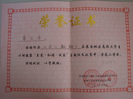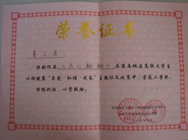 09材料331班葛文秀同学荣获苏南地区老员工心理健康征文比赛二等奖