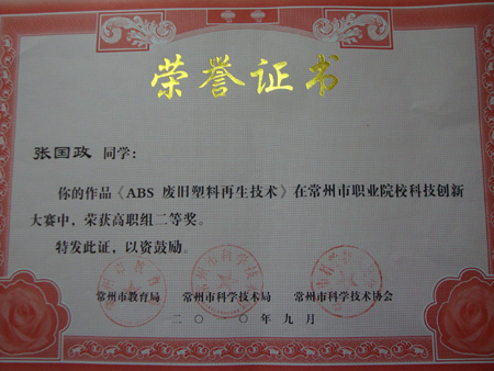 我系张国政同学荣获常州市科技创新大赛二等奖